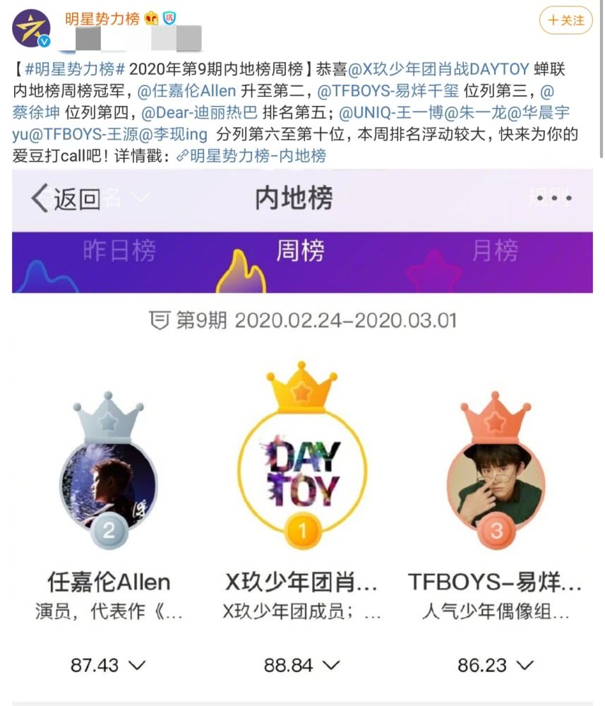 Trong đầu tháng 3 năm nay, Tiêu Chiến vẫn là người dẫn đầu trong bảng xếp hạng minh tinh quyền lực nhưng đến kỳ mới nhất gần đây, nam minh tinh đã rơi hạng xuống vị trí thứ 2. Nếu tình trạng này vẫn tiếp diễn khi Tiêu Chiến vẫn mãi ẩn mình thì việc anh chàng rơi khỏi top 3 trong cuộc đua này là điều hoàn toàn có thể xảy ra.