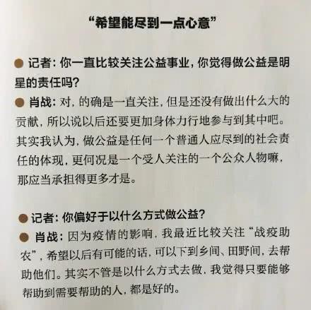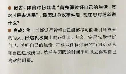 Trong phỏng vấn, Tiêu Chiến cũng kiên trì hướng dẫn fan hâm mộ theo con đường đúng đắn, muốn mọi người sống cuộc sống của mình, đừng làm ra những hành vi quá khích. Tiêu Chiến muốn đích thân tham gia vào hoạt động công ích, hy vọng sau này có thể đến những hộ dân, đồng ruộng để giúp đỡ nông dân.