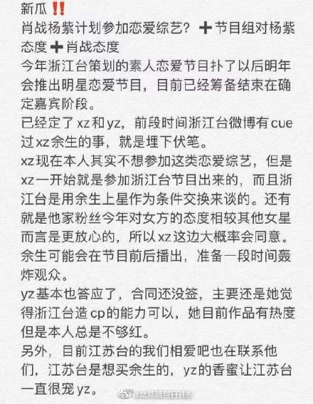 Sau lần hợp tác trong Dư sinh thì mới đây có tin Tiêu Chiến và Dương Tử sẽ tham gia chương trình hẹn hò của đài truyền hình Chiết Giang. Mọi chuyện còn phải xem thêm thái độ của nhà đài đối với cả hai. Được biết, chương trình đã hoàn thành công tác chuẩn bị và đang trong giai đoạn xác định khách mời và đã mời được xz và yz (tên hai chữ cái trong trong chữ pinyin của Tiêu Chiến và Dương Tử).