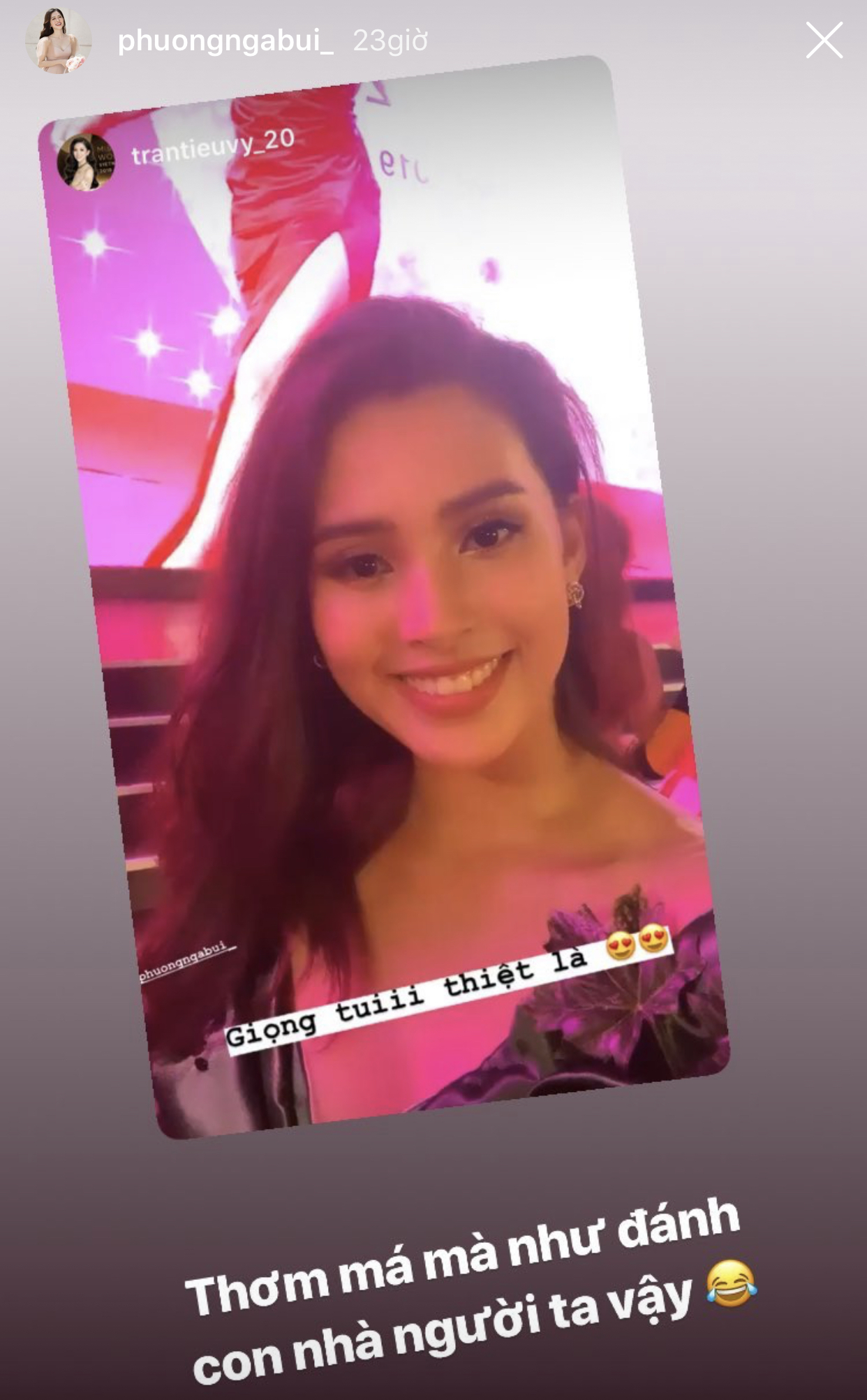 Phương Nga “khoái chí” chia sẻ lại đoạn clip “cưỡng hôn” Tiểu Vy thành công