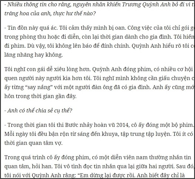 Trong quá trình cô ấy đóng phim, có một diễn viên nam thường nhắn tin quan tâm, hỏi han. Tôi vô tình đọc tin nhắn qua lại giữa hai người. Sau đó, tôi nói với Quỳnh Anh rằng: 'Em dừng lại được rồi. Anh biết đây chỉ là những tin nhắn say nắng thôi. Anh biết do anh không quan tâm nhưng em suy nghĩ kỹ xem họ có xứng đáng với em không? Họ cũng có gia đình rồi, nếu em cứ nhắn tin như vậy sẽ ảnh hưởng ít nhiều'.