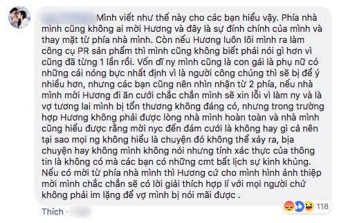 Tuy mang danh bênh vực hôn thê nhưng với những chia sẻ “dằn mặt” tình cũ khiến chàng thiếu gia bị “mất điểm” trầm trọng trong mắt cư dân mạng như “phía nhà mình cũng không ai mời Hương và đây là sự đính chính của mình và thay mặt từ phía nhà mình. Còn nếu Hương luôn lôi mình ra làm công cụ PR sản phẩm thì mình cũng không biết phải nói gì hơn vì cũng đã từng 1 lần rồi” hay “nếu có mời từ phía nhà mình thì Hương cứ cho mình hình ảnh thiệp mời mình chắc chắn sẽ có lời giải thích hợp lí với mọi người chứ không phải im lặng để vợ mình bị nói mãi được“.