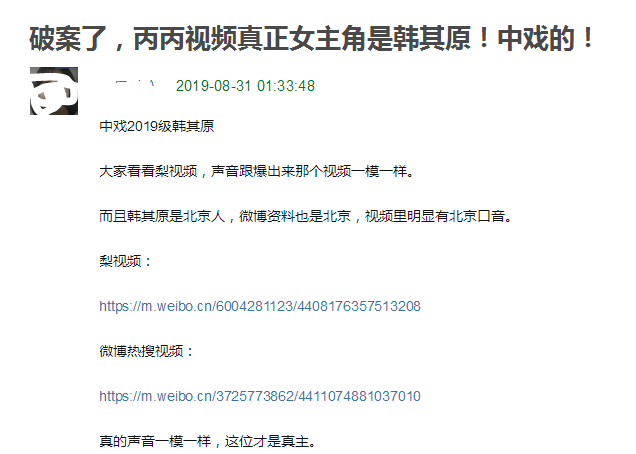 Thế nhưng, không tới nửa đêm sự tình lại có sự chuyển biến rõ rệt khi có cư dân mạng phát hiện, nữ nhân vật chính trong video này hình như không phải là Tần Ngưu Chính Uy mà là một hoa khôi trường Trung Hí, tên Hàn Kỳ Nguyên - sinh năm 2002 vẫn chưa đủ 18 tuổi.