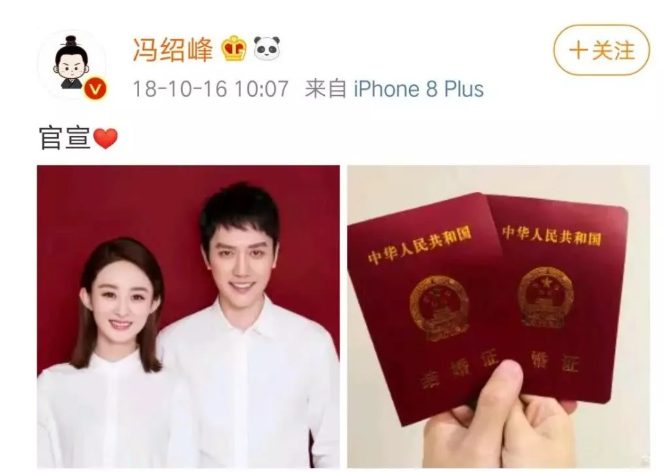 Nhưng rồi đúng 10 giờ 07 phút, ngày 16 tháng 10 năm 2018 (sinh nhật Triệu Lệ Dĩnh vào 16 tháng 10, sinh nhật Phùng Thiệu Phong vào 07 tháng 10), cặp đôi công khai giấy chứng nhận đăng ký kết hôn, giới giải trí Hoa Ngữ chính thức có thêm một cặp vợ chồng nữa.