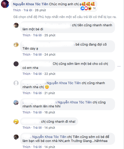 Tóc Tiên - một người bạn thân thiết của Đông Nhi và Ông Cao Thắng cũng vui mừng gửi lời tới đàn chị. Giọng ca Ngày tận thế chia sẻ “Chúc mừng anh chị ạ”. Lời chúc của Tóc Tiên nhanh chóng nhận được nhiều sự chú ý từ phía khán giả và ai nấy đều lên tiếng nhắc khéo rằng, “cô Tiên cũng đã có gia đình rồi và cũng nhanh nhanh có em bé đi thôi”, “Chị Tiên cũng nhanh nhanh làm một bé đi”, “Chị cũng nhanh nhé ạ”, “Em bé cũng đang đợi cô Tiên nè”…