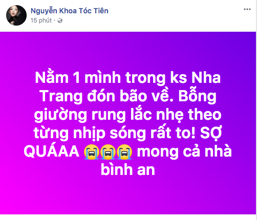 Tuy nhiên, thông tin cơn bão số 12 đổ bộ đúng ngày đêm thi diễn ra đã khiến nhiều người hoang mang. Trong đó, nữ ca sĩ Tóc Tiên cũng thấy sợ trước những dấu hiệu của cơn bão sắp đổ bộ. Trên trang cá nhân cô viết: “Nằm một mình trong khách sạn Nha Trang đón bão về. Bỗng giường rung lắc nhẹ theo từng nhịp sóng rất to!”