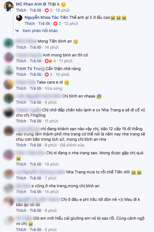 Chỉ sau ít phút đăng đàn, dòng trạng thái của Tóc Tiên nhanh chóng nhận được nhiều bình luận phản hồi từ phía khán giả chúc cô bình an trong đó có cả MC Phan Anh.