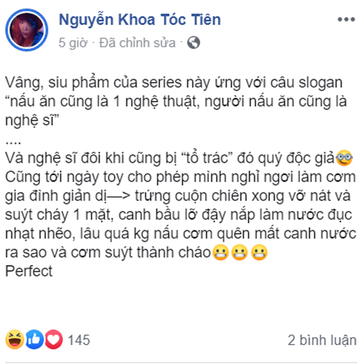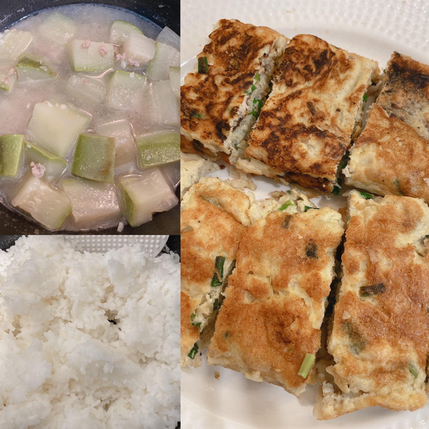 “Cũng tới ngày tôi cho phép mình nghỉ ngơi làm cơm gia đình giản dị: trứng cuộn chiên xong vỡ nát và suýt cháy một mặt, canh bầu lỡ đậy nắp làm nước đục nhạt nhẽo, lâu quá không nấu cơm quên mất canh nước ra sao và cơm suýt thành cháo” - đoạn chia sẻ vui nhộn của Tóc Tiên.