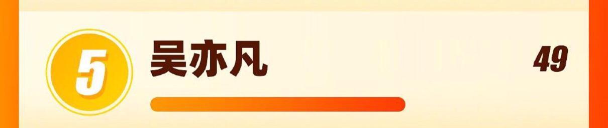 Với sức nóng 49 điểm, Ngô Diệc Phàm chiếm vị trí thứ 5. Được mệnh danh là chàng trai đẹp nhất Trung Quốc, chỉ cần dựa vào nhan sắc và khí chất của Ngô Diệc Phàm đủ khiến bất kỳ cô gái nào cũng phải đổ gục. Vài tháng trước, dân mạng khá thất vọng với ngoại hình tăng cân của anh chàng khiến gương mặt giảm bớt đi độ đẹp trai. Tuy nhiên gần đây, Ngô Diệc Phàm đang lấy lại phong độ, và vóc dáng hoàn mỹ khi xưa của mình.