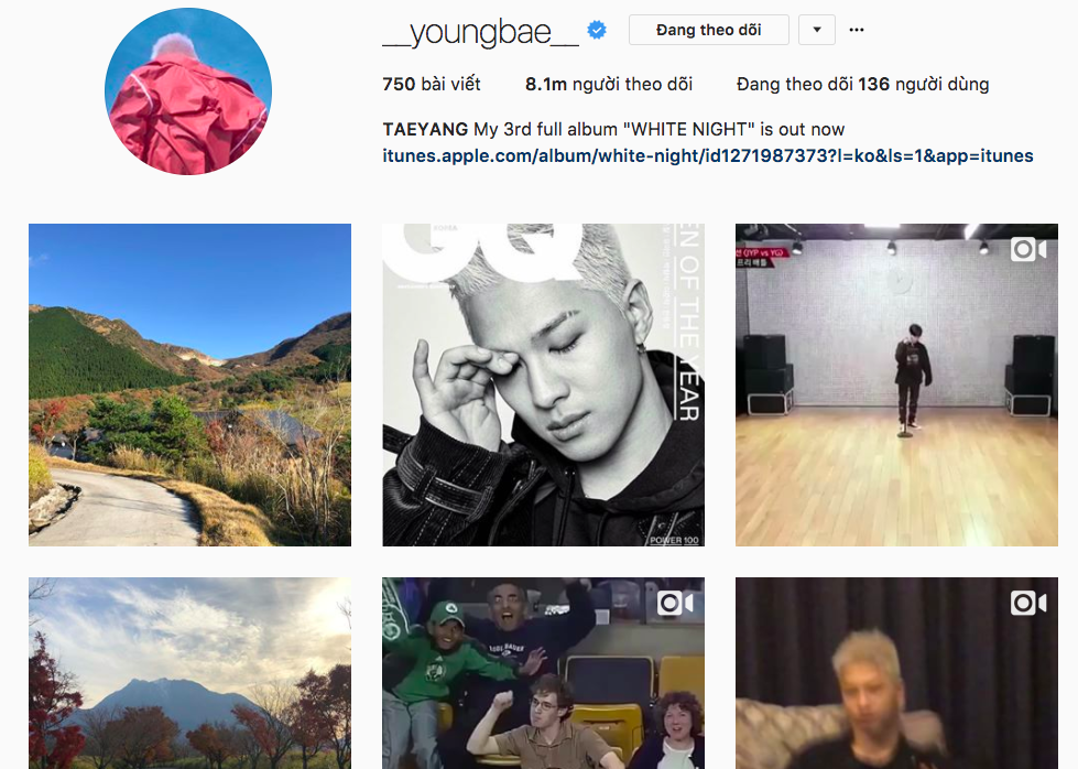 Sở hữu tài khoản có 8,1 triệu người theo dõi, Taeyang giành vị trí thứ 8 trong bảng xếp hạng nam thần K-biz có nhiều fan nhất trên Instagram. Taeyang tên thật là Dong Youngbae, sinh năm 1988. Gặt hái nhiều thành công cả khi hoạt động cùng Big Bang lẫn solo, giọng ca Eyes, nose, lips thực sự chinh phục trái tim khán giả cũng như ngày càng khẳng định vị thế tại K-biz.