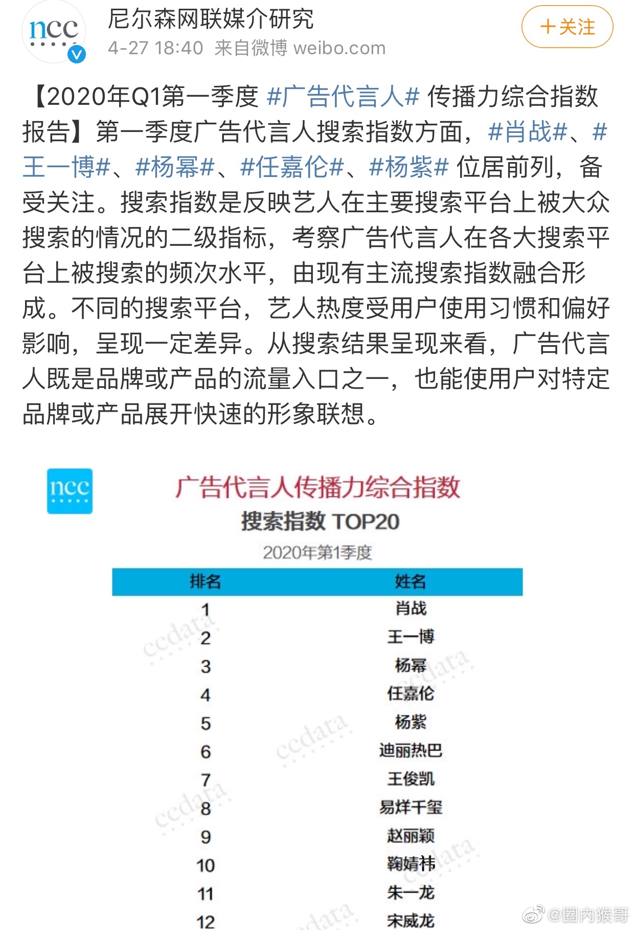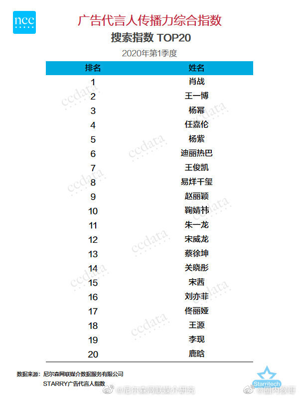 Bảng xếp hạng chỉ số Top 20 sức truyền bá quảng cáo của người đại diện vào quý I năm 2020 (tương đương với giá trị thương mại của minh tinh Hoa Ngữ):
