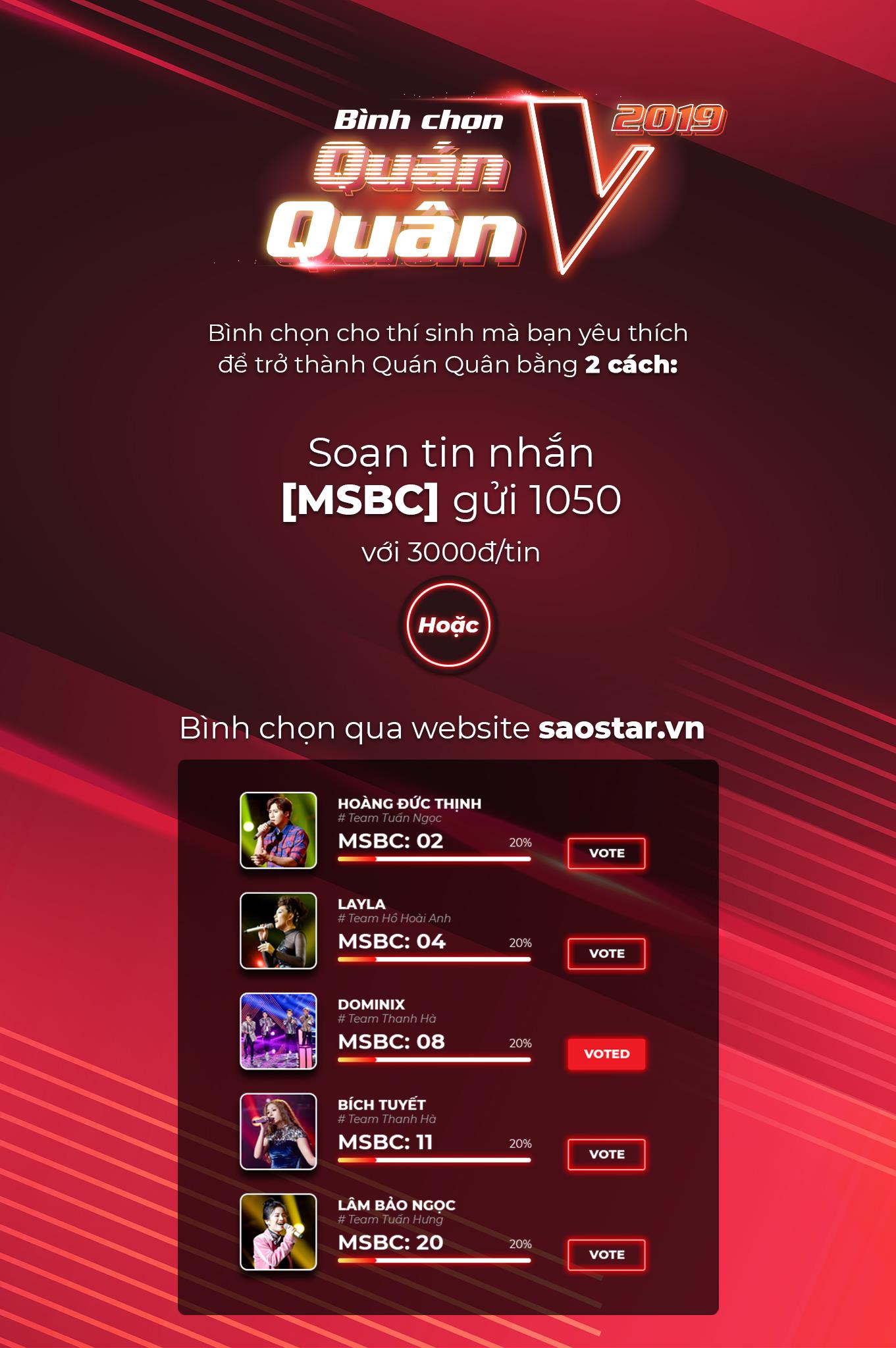 Ngay khi đêm thi Bán kết khép lại, cổng bình chọn quán quân The Voice 2019 đã được mở để khán giả có thể vote cho thí sinh mà mình yêu thích nhất.