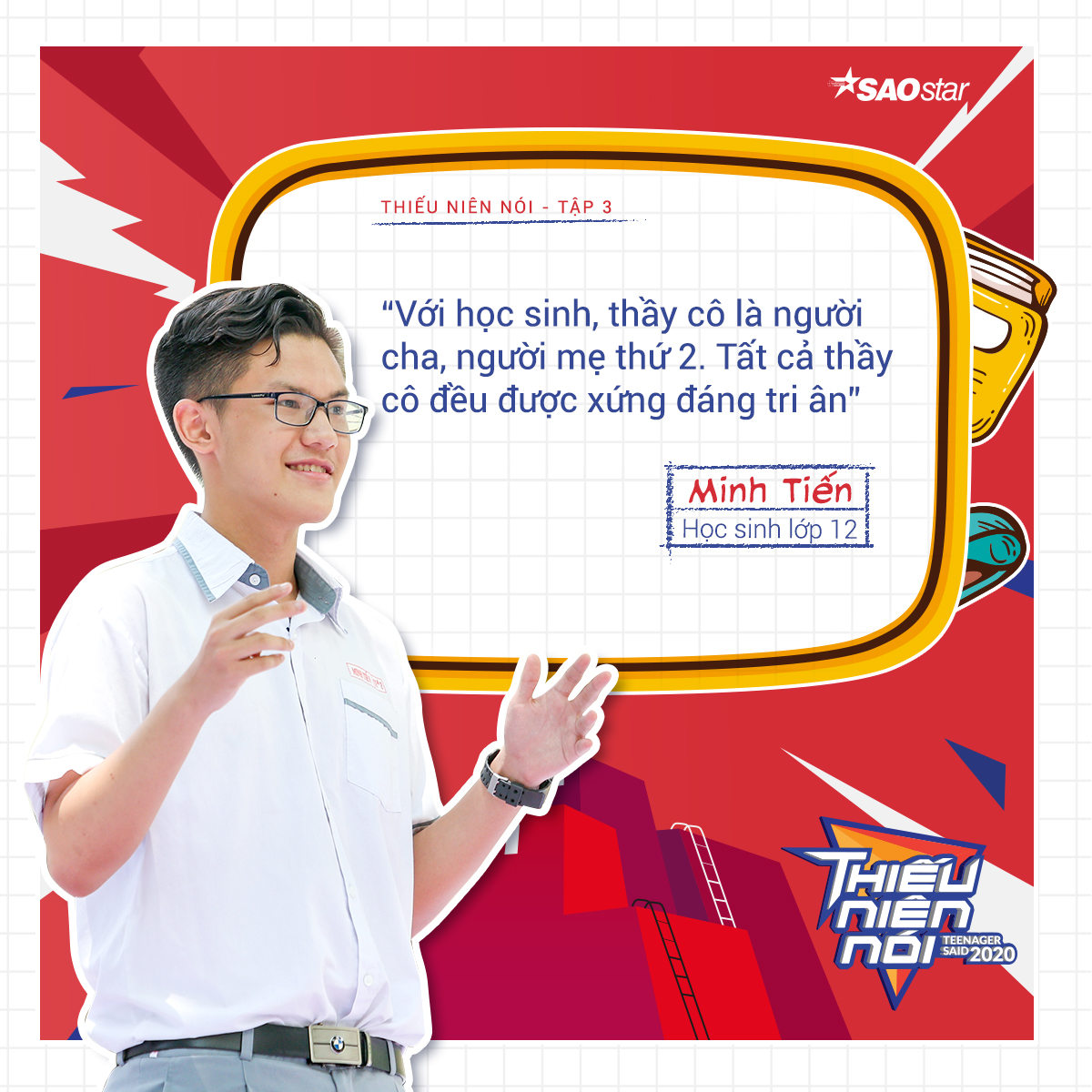 Minh Tiến đã mạnh dạn bày tỏ tình cảm và nói lời tri ân thầy cô khi cậu nhận ra rằng: “12 năm tôi mất đi hết những năm cơ hội để nói lời tri ân với thầy cô và đây là cơ hội cuối cùng”.