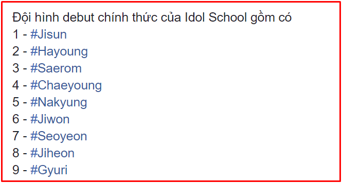 Trải qua hành trình hơn 2 tháng luyện tập chăm chỉ, cuối cùng Idol School đã đi đến đêm chung kết để tìm ra được 9 cái tên xuất sắc nhất góp mặt vào nhóm nhạc nữ của mình. Sau 3 màn trình diễn tuyệt vời của 18 cô gái, top 9 của chương trình đã lần lượt được gọi tên trong sự hồi hộp hòa với những cơn mưa nước mắt của thí sinh và khán giả.
