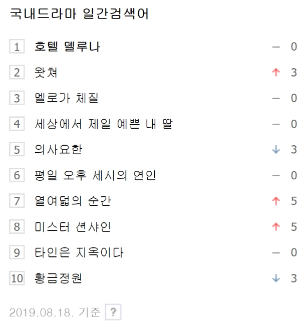 Naver có một bảng xếp hạng các bộ phim truyền hình được tìm kiếm nhiều nhất ở Hàn Quốc với thứ hạng hàng ngày. Được tìm kiếm trực tuyến không có nghĩa là những bộ phim truyền hình này được xem nhiều nhất, nhưng nó là bộ phim truyền hình được phát hành nhiều nhất trong ngày. Một điều thú vị là những thứ hạng này sẽ thay đổi liên tục theo ngày, cùng chờ đón nhé!