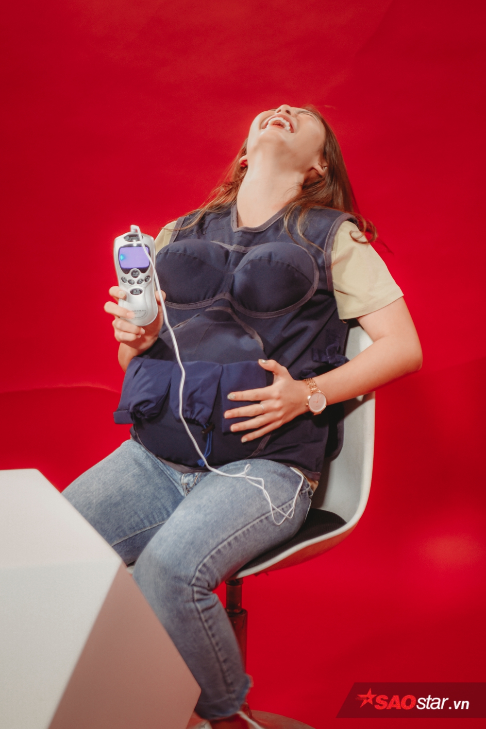 Để các nghệ sĩ được trải nghiệm nhiều cảm giác khác nhau tương đương với hiện tượng đau bụng, cơn gò mà các bà mẹ phải chịu đựng, ekip đã thử tăng dần các mức độ được thiết lập trong chiếc áo bầu này. Theo đó, cô nàng được “tận hưởng” những cảm giác đặc biệt.