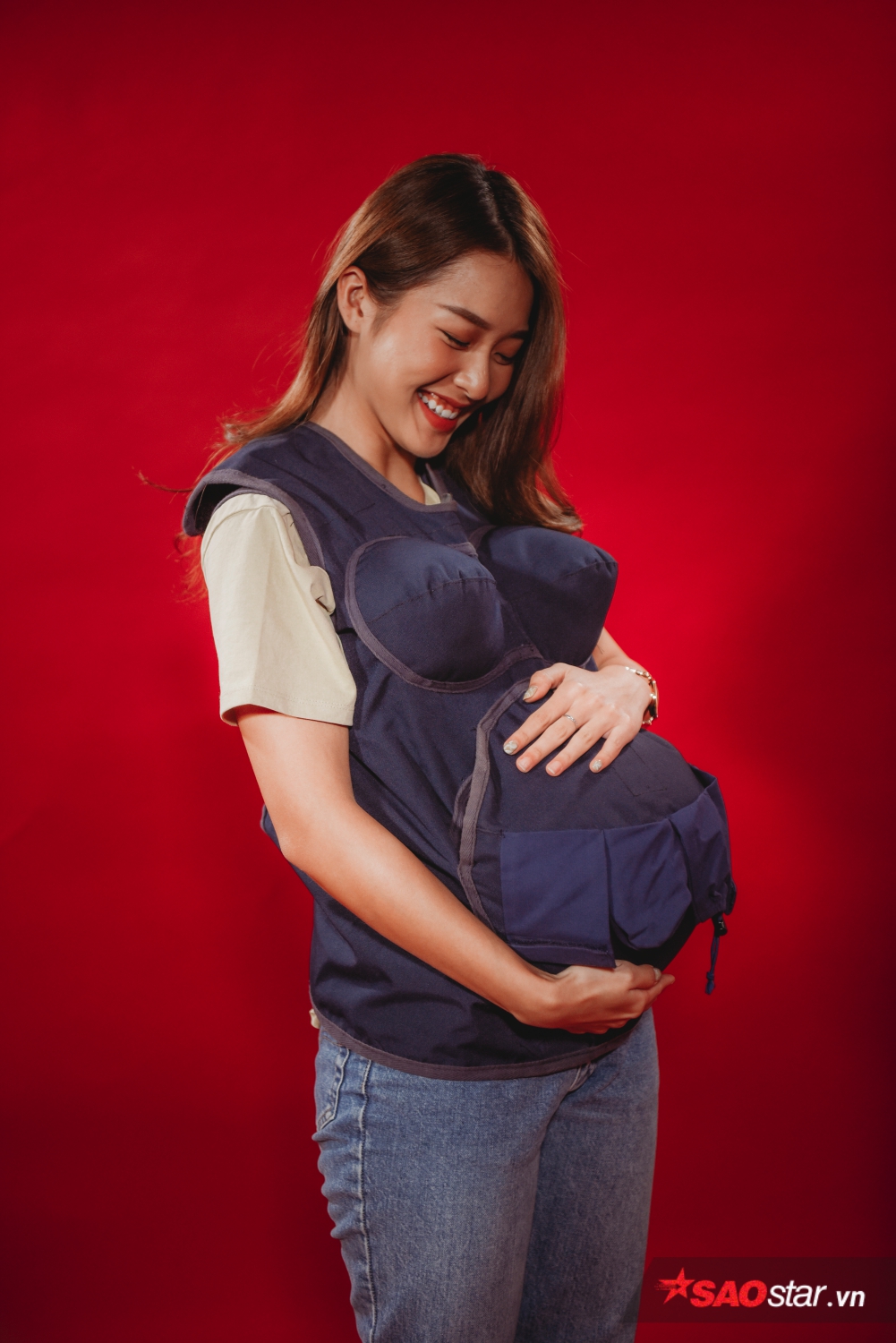 Khi mặc chiếc áo bầu, Khả Ngân không ngờ chiếc áo này lại có cân nặng ngoài sức tưởng tượng: “Khi mới đeo vào, Ngân không nghĩ rằng nó nặng như vậy, còn hơn mang một quả tạ. Mang cái bầu này tự nhiên mình ra dáng hơn, thấy mình có trách nhiệm hơn nên Ngân khá thích thú”.
