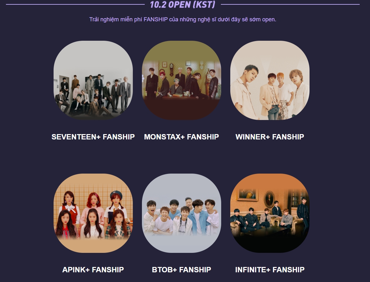 Riêng ở Việt Nam, các fan cứng tham gia Fanship của các nghệ sĩ Vpop vẫn sẽ được miễn phí đến hết 31/12/2019. Các nghệ sĩ Việt đã mở Fanship gồm: Quốc Trường, Vũ Cát Tường, Bích Phương, Soobin Hoàng Sơn, Hương Giang, Đức Phúc, Gin Tuấn Kiệt, Monstar, Uni5, Zero9, Amee.