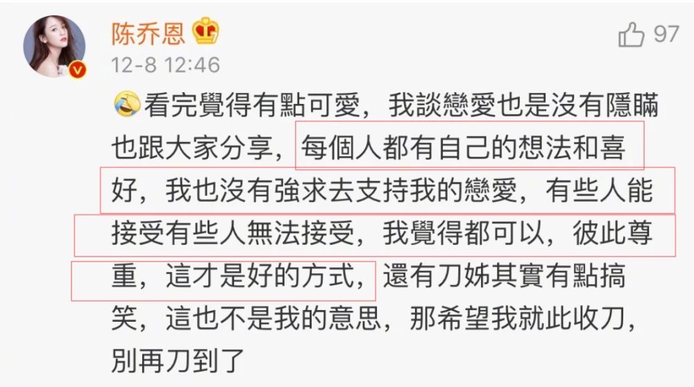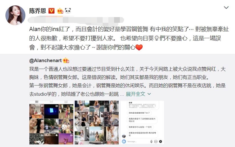 Ngay sau đó, Ngải Luân lên tiếng giải thích, thanh minh từng chuyện một trong quá khứ. Trần Kiều Ân bày tỏ sự tin tưởng ở bạn trai, chia sẻ lại bài viết của anh. Thế nhưng đối mặt với việc fan hâm mộ quay lưng, Trần Kiều Ân lại bỏ ra im lặng.