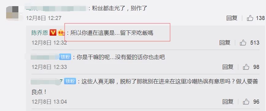 Sau khi Trần Kiều Ân đăng tải bài viết dành cho fan, lập tức anti-fan liền nhảy vào bình luận phía dưới: “Fan hâm mộ đều bỏ đi hết sạch, đừng tốn công vô ích“. Đọc được dòng ý kiến này, Trần Kiều Ân tỏ ra giận dỗi: “Cho nên bạn vẫn còn ở đây để ăn vạ, hóng chuyện à!”.