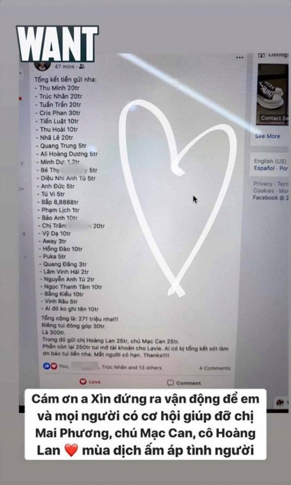 Theo danh sách, bản thân Trấn Thành đã ủng hộ 30 triệu đồng. Ngoài ra các nghệ sĩ như Thu Minh, Trúc Nhân, Hồng Đào, Bằng Kiều, Tiến Luật, Lâm Vỹ Dạ, Bảo Anh, Cris Phan, Puka, cặp đôi Diệu Nhi - Anh Tú, Anh Đức, Quang Trung,… Tổng số tiền kêu gọi đóng góp là 300 triệu. Trong đó nam danh hài dành tặng chú Mạc Can 25 triệu, cô Hoàng Lan 25 triệu. Còn lại 250 triệu sẽ dành mở tài khoản cho bé Lavie - con gái Mai Phương.