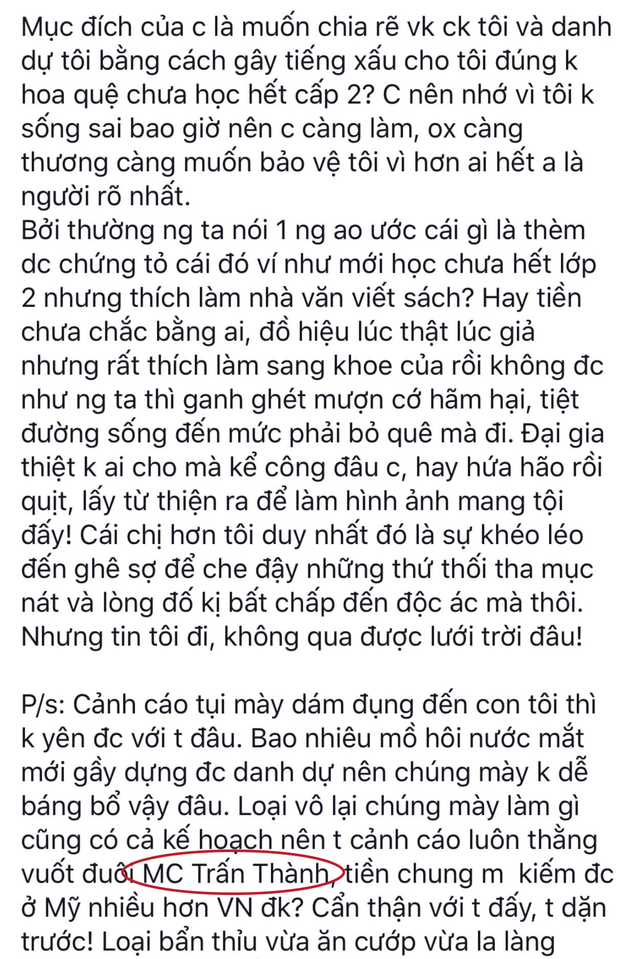 Cụ thể trong dòng trạng thái gửi đến nữ ca sĩ Vy Oanh, Hoa hậu Thu Hoài đề cập đến sự việc Vy Oanh là người đã đứng sau phá hoại chuyện tình cảm của cặp đội Trấn Thành - Hari Won.