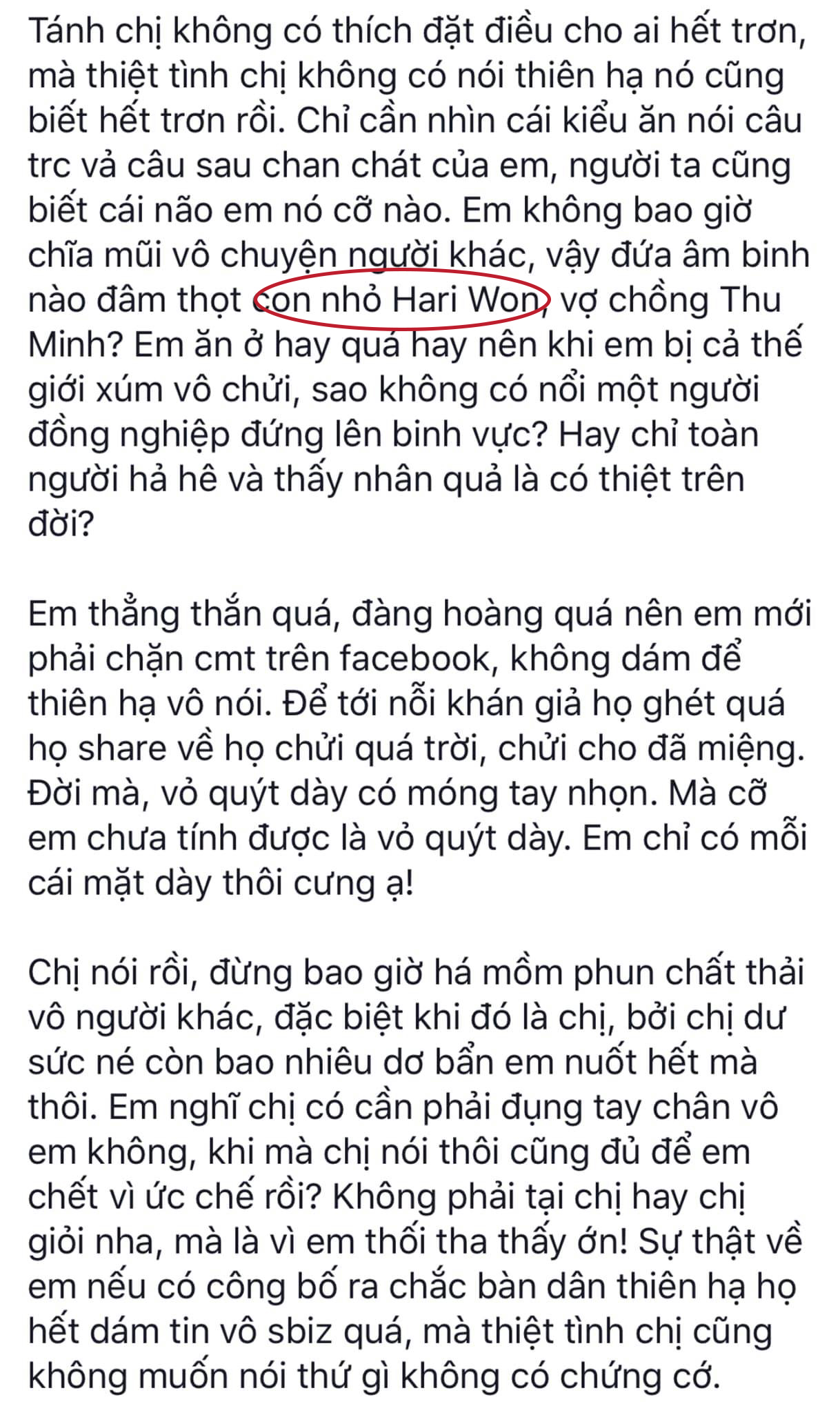 Ngay khi ông xã bị lôi vào cuộc, thì bất ngờ Hari cũng đăng dòng trạng thái đầy ẩn ý. Công chúng tinh ý nhận ra ngay sự việc ắt hẳn có liên quan đến sự việc trên. Bởi lẽ vào lúc này, Hari và Trấn Thành khá bận rộn với lịch trình cuối năm. Trấn Thành thì tất bật với hai sản phẩm phim chiếu rạp vào đầu năm mới, Hari Won thì chỉ mới vừa ra mắt MV. Nên nếu chuyện không mang tính hệ trọng thì Hari Won cũng chẳng màn để tâm.