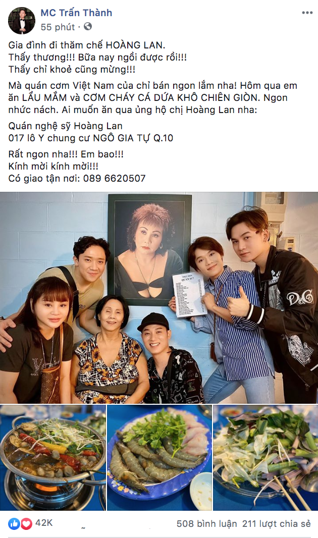 Là những người em trong nghề, MC Trấn Thành, Lê Giang, Trúc Nhân, Quang Trung, Ali Hoàng Dương đã cùng nhau đến thăm và ủng hộ quán ăn của nữ diễn viên sinh năm 1959. Trên trang Facebook, Trấn Thành chia sẻ: “Gia đình đi thăm chế Hoàng Lan. Thấy thương, bữa nay ngồi được rồi. Thấy chỉ khoẻ cũng mừng. Mà quán cơm Việt Nam của chỉ bán ngon lắm nha. Hôm qua em ăn lẩu mắm và cơm cháy cá dứa khô chiên giòn. Ngon nhức nách. Ai muốn ăn qua ủng hộ chị Hoàng Lan nha. Quán nghệ sỹ Hoàng Lan, 017 lô Y chung cư NGÔ GIA TỰ Q.10. Rất ngon nha, em bao. Kính mời kính mời. Có giao tận nơi: 0896620507“.