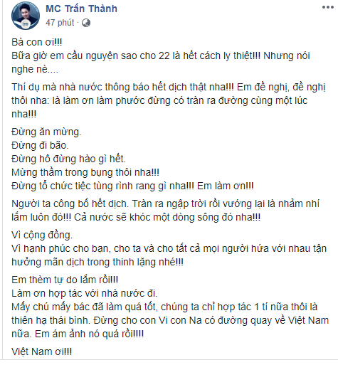MC Trấn Thành viết: “Bà con ơi! Bữa giờ em cầu nguyện sao cho 22 là hết cách ly thiệt! Nhưng nói nghe nè. Thí dụ mà nhà nước thông báo hết dịch thật nha, em đề nghị, đề nghị thôi nha: là làm ơn làm phước đừng có tràn ra đường cùng một lúc nha!”