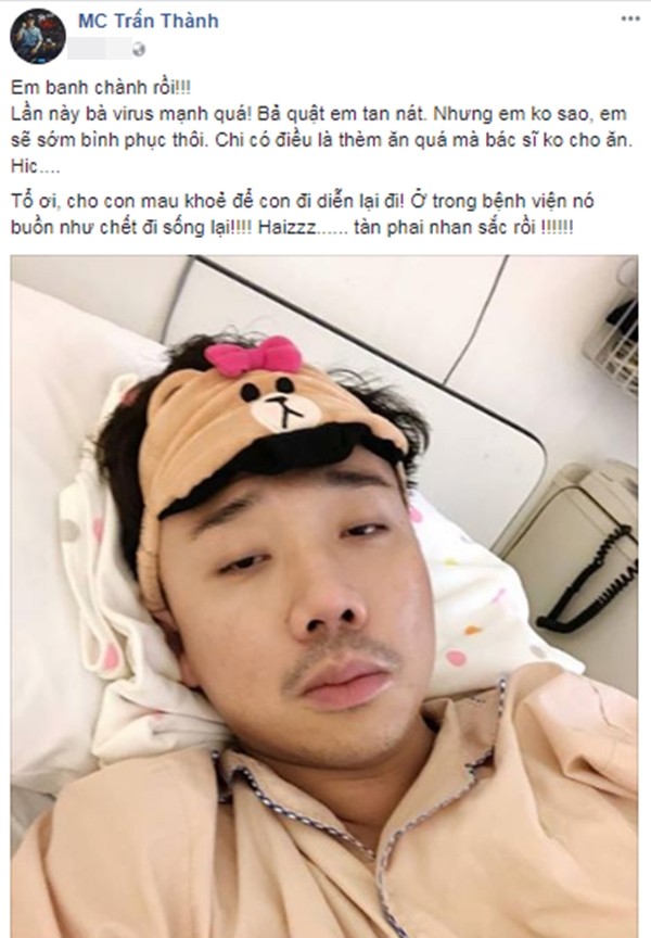 Kèm theo lời than thở về việc “tàn phai nhan sắc”, Trấn Thành cầu nguyện mau khỏi bệnh để thoát khỏi khung cảnh “ảm đạm” và thiếu thức ăn trong bệnh viện. Anh viết: “Tổ ơi, cho con mau khỏe để con đi diễn lại. Ở trong bệnh viện nó buồn như chết đi sống lại”.
