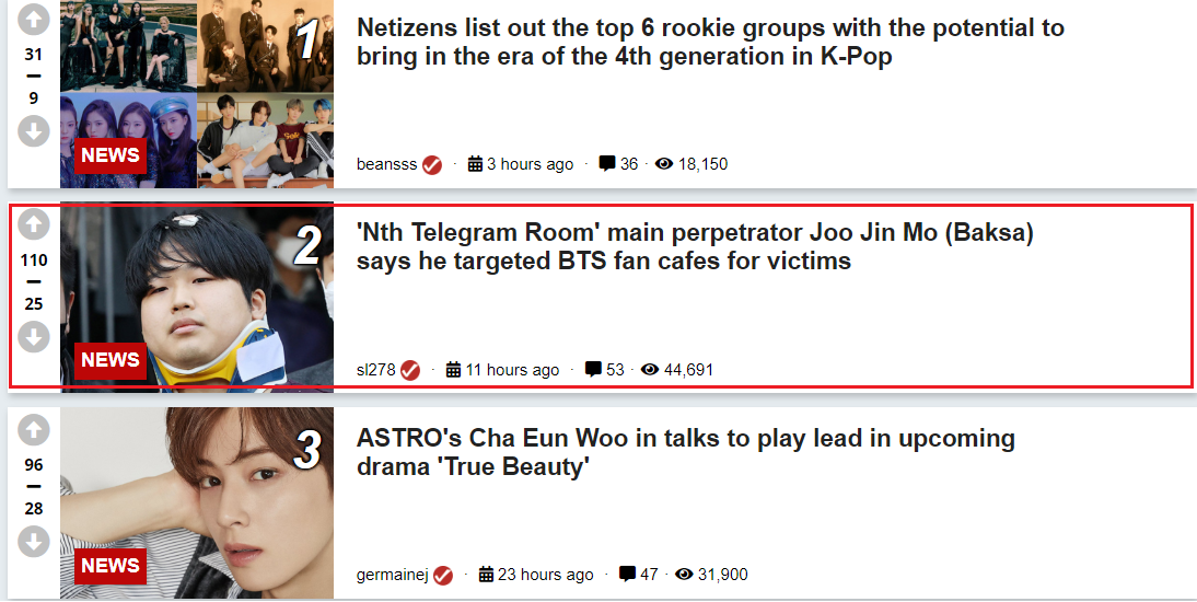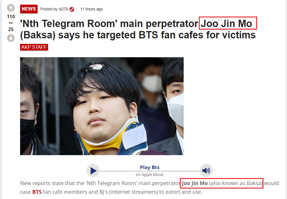 Vào ngày 24/04 vừa qua, tờ Allkpop đã phát hành bài báo với nội dung, thủ phạm chính của Phòng chat thứ N trên Telegram - Joo Jin Mo (Baksa/Tiến sĩ) khai rằng hắn ta đã nhắm vào người hâm mộ BTS trên các fancafe (một dạng blog do chính công ty quản lý hoặc do người hâm mộ lập ra), để tống tiền và bắt làm nô lệ tình dục trao đổi, mua bán văn hóa phẩm đồi trụy từ họ trên phòng chat.