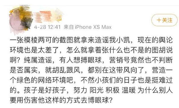 “Lấy một tấm hình không rõ ràng đến tung tin đồn, bịa đặt Tiểu Khải của tôi, hoàn cảnh dư luận hiện giờ cũng thật quá kém. Làm sao có thể lấy bức hình cũng không biết là gì ra ăn nói lung tung? Đây là tin đồn thuần túy, có người muốn thu hút sự chú ý, bloggers cũng không hề phán đoán liệu đây có phải sự thật hay không mà đã hùa theo, đừng ở đây mang thêm phiền phức nữa, kinh doanh, tạo nên một môi trường mạng sạch đi. Nếu không thì ngày tháng của những đứa trẻ cũng thật khó khăn. Đứa trẻ là đứa trẻ ngoan, nỗ lực, tươi sáng, tích cực, ấm áp, tại sao người khác phải dùng phương thức tổn hại cậu ấy như thế để thu hút sự chú ý?”