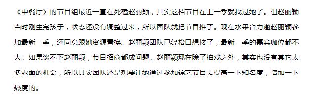 Theo nguyên văn của nguồn tin này cho biết: “Thực tế, Nhà hàng Trung Hoa đã ngỏ lời mời đến Triệu Lệ Dĩnh vào mùa trước. Tuy nhiên, khi ấy nữ diễn viên vừa mới sinh con, cơ thể chưa ổn định thế nên phía đoàn đội (công ty quản lý) đã từ chối đề nghị này. Bây giờ, đài Hồ Nam đang quyết tâm mời cho bằng được nàng tiểu hoa tham gia mùa mới nhất và cũng đồng ý giao những dự án tốt tiếp theo nếu như cô hợp tác.