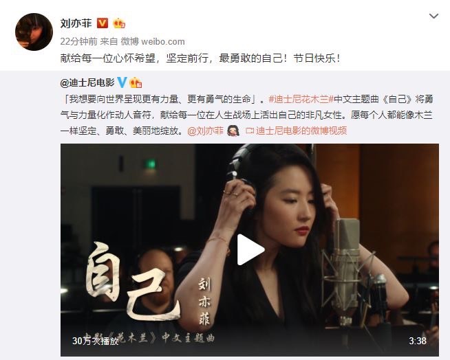 Cách đây ít giờ, Lưu Diệc Phi đã “đốn tim” người hâm mộ khi đăng tải 1 đoạn video do chính cô hát ca khúc Myself, với lời chúc tốt đẹp nhất đến tất cả phụ nữ trên thế giới nhân dịp ngày 8/3. Xuất hiện với vẻ ngoài xinh đẹp, rạng rỡ cùng với đó là sự đầu tư vô cùng nghiêm túc cho sản phẩm của mình, không những vậy giọng hát của cô nàng cũng khiến khán giả vô cùng ấn tượng với những nốt cao chót vót và những nốt trầm đầy tâm trạng. Myself là ca khúc OST chính của bộ phim điện ảnh đang được khán giả vô cùng mong chờ - Mulan, bài hát được “Thần tiên tỷ tỷ” dành tặng riêng cho tất cả những người phụ nữ phi thường đang sống trên chiến trường cũng như đang cố gắng vươtj qua những khó khăn trong cuộc đời mình. Hy vọng tất cả mọi người đều có thể giống như cô nàng Hoa Mộc Lan xinh đẹp, luôn kiên định, dũng cảm, dám đương đầu với mọi thử thách.