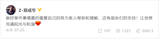 Hôm nay (18/10), từ khóa Bài viết của ba Trịnh Sảng đã đứng đầu vị trí ở nhiệt sưu. Ông viết trên Weibo: “Muốn làm tốt bất kỳ chuyện gì cũng cần phải có sự cố gắng của bản thân, sự giúp đỡ và thấu hiểu từ gia đình và còn có sự ủng hộ của bạn bè. Vậy thì thế giới này mới tràn đầy hi vọng và hài hòa”.