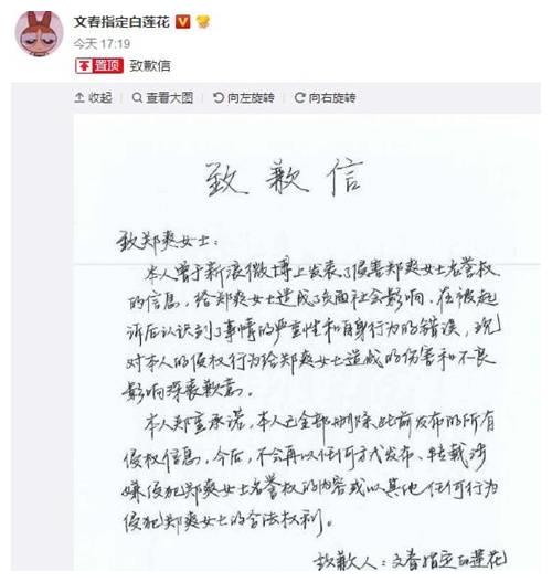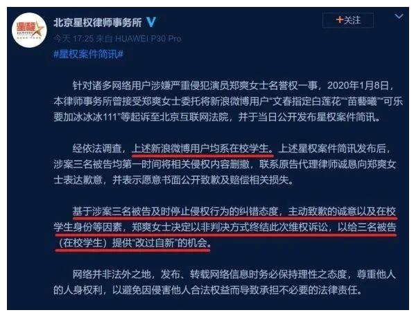 Hiện tại đã hơn 1 tháng kể từ sau khi sự việc đó diễn ra, mới đây ngày 26/2 vừa qua công ty luật sư Bắc Kinh đã đăng tải 1 bài viết liên quan đến vụ án xúc phạm danh dự của Trịnh Sảng lên trên Weibo chính thức, họ đã cập nhật cụ thể về những tài khoản xúc phạm danh dự Trịnh Sảng. Sau khi qua 1 tháng điều tra, 3 bị cáo được cho là kẻ đứng sau sự việc đã đăng bài viết công khai xin lỗi Trịnh Sảng về sự việc trên, đồng thời sẽ chịu bồi thường những thiệt hại liên quan đến vụ việc này.