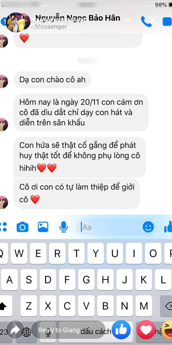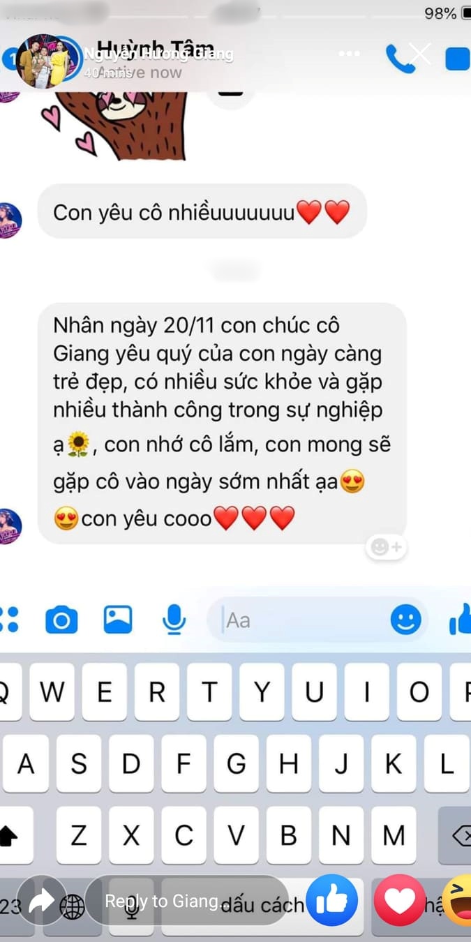 Mặc dù chương trình đã kết thúc nhưng dàn thí sinh The Voice Kids - Giọng hát Việt nhí 2019 vẫn luôn dành khá nhiều tình cảm, sự quan tâm của mình đến HLV. Đặc biệt, trong ngày Nhà giáo Việt Nam 20/11, các trò cưng trong Team Hoàng gia như: Chấn Quốc, Bảo Hân, Khánh Vy hay Thanh Tâm và Hồng Ngọc đã gửi những lời tri ân tốt đẹp nhất đến HLV Hương Giang - người cô đã dìu dắt các bé xuyên suốt mùa giải.