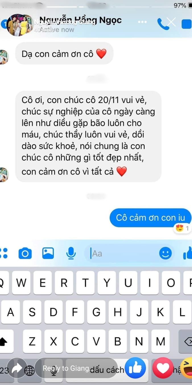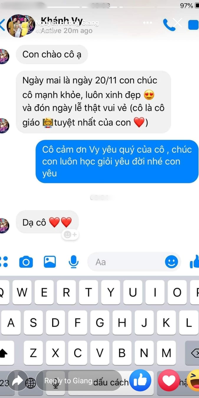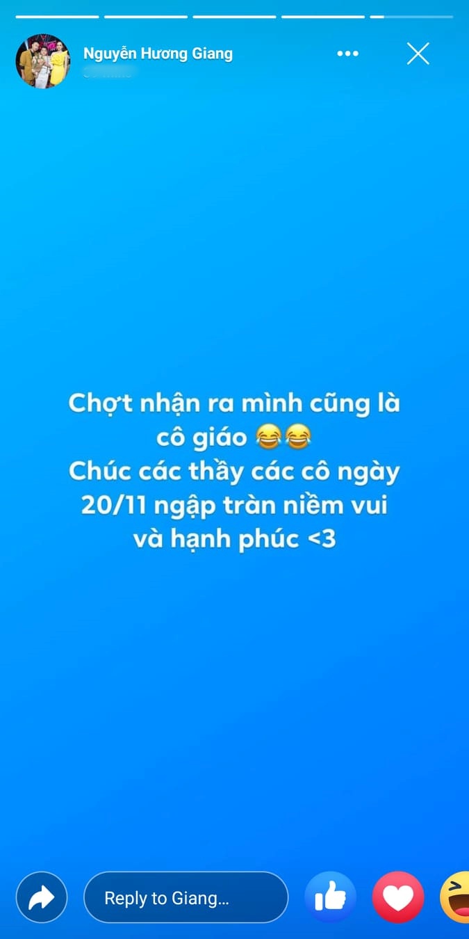 Qua những lời chúc từ các trò cưng, Hương Giang chợt bồi hồi và nhận ra bản thân mình đã từng là cô giáo, người đẹp chia sẻ: “Chợt nhận ra mình cũng là cô giáo. Chúc các thầy cô 20/11 ngập tràn niềm vui và hạnh phúc”. Có thể nói, điều đáng ngưỡng mộ nhất đó chính là dù rời khỏi chương trình, mỗi người một nơi nhưng tất cả vẫn nhớ về nhau.
