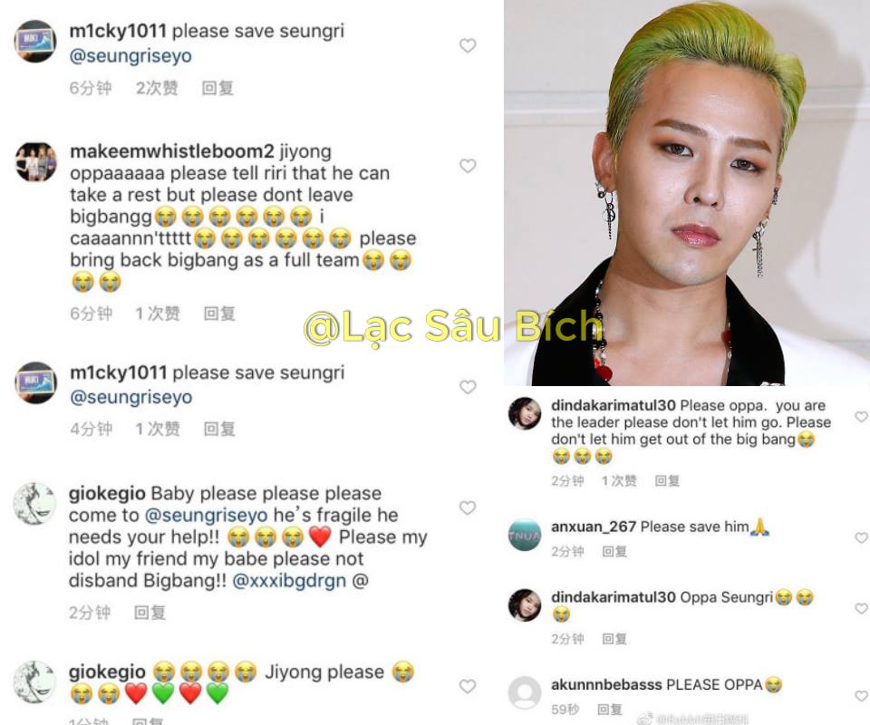Chính vì sự luyến tiếc này, trưởng nhóm G-Dragon mặc dù đang phải nhập ngũ để thực hiện nghĩa vụ công dân cũng bị các fan “triệu hồi”, nhờ anh chàng “cứu” Seungri để BigBang vẫn đầy đủ 5 thành viên. Không ít fan đã gửi “tâm thư” về cho G-Dragon bao gồm những bình luận, tin nhắn với hi vọng Seungri sẽ không bị đuổi khỏi BigBang bởi YG Entertainment. Và mới đây, xuất hiện thông tin có hơn 10.000 fan đã kí kiến nghĩ bênh vực Seungri và giữ anh chàng tiếp tục là một nghệ sĩ của Kbiz bất chấp hiện tại Seungri đang là một nghi phạm của một đường dây mại dâm và ma tuý đang gây sốt tại xứ sở Kim chi.