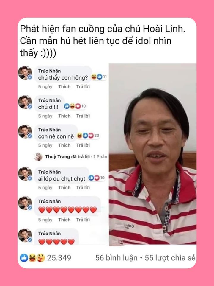 Trúc Nhân quả đúng là một fan boy dễ thương nhất của chú Hoài Linh. Mặc dù “đu” thần tượng bị bất bại thê thảm thế nhưng có vẻ Trúc Nhân không hề thấy “quê”. Mới đây, Trúc Nhân lại khiến khán giả thêm một lần “cười bò” khi tag tên nghệ sĩ Hoài Linh vào status của mình và “than vãn” về việc livestream hôm bữa của “idol”. Anh hài hước viết: “Con xem Livestream của Chú/Trời biết, đất biết chỉ có Chú là không biết…”.