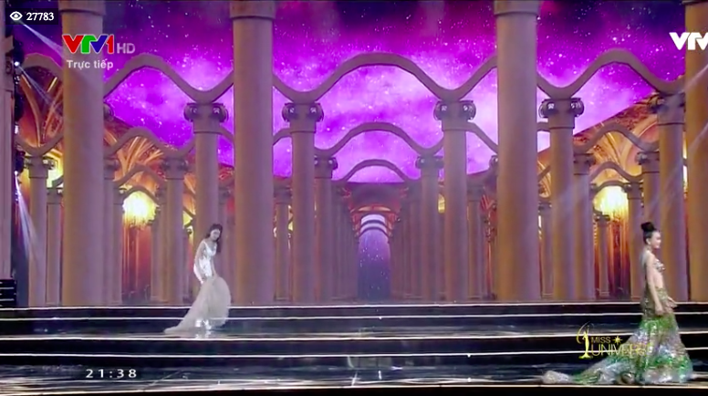 20h10: Sân khấu Hoa hậu Hoàn vũ Việt Nam 2017 chính thức sáng đèn. Phương Vy cùng top 42 khuấy động không khí đêm chung kết bằng tiết mục mở màn trên nền nhạc Diamond.