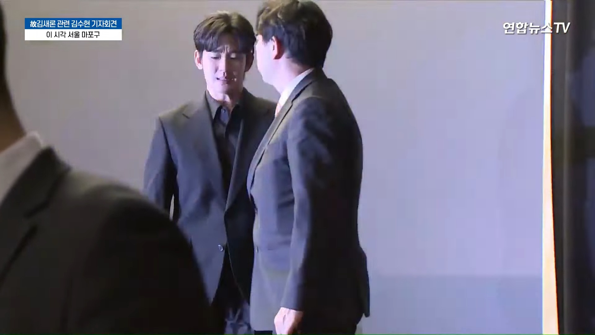Sau 45 phút trình bày, Kim Soo Hyun rời khỏi khu vực họp báo với gương mặt giàn giụa nước mắt. Anh không đứng vững, phải nhờ sự hỗ trợ từ phía luật sư.