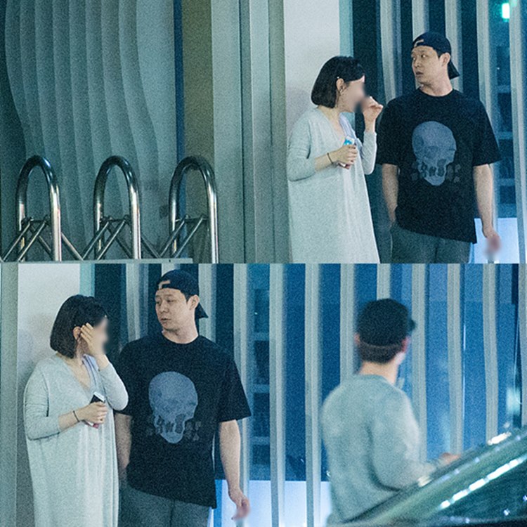 Hwang Hana và Park Yoochun xuất hiện công khai trước một nhà hàng.