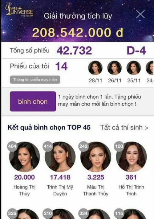 Tuy nhiên, đây chỉ là kết quả tính đến thời điểm hiện tại. Cổng bình chọn sẽ kéo dài đến đêm chung kết, vì thế các thí sinh khác vẫn còn cơ hội bứt phá.