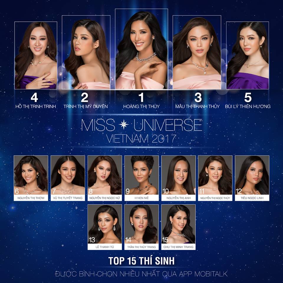 Mới đây, thông qua Fanpage chính thức của Hoa hậu Hoàn vũ Việt Nam 2017, BTC cuộc thi công bố top 15 thí sinh được yêu thích nhất qua ứng dụng bình chọn.