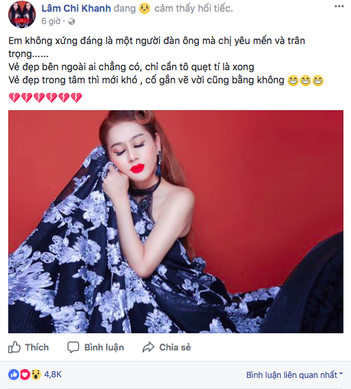 “Em không xứng đáng là một người đàn ông mà chị yêu mến và trân trọng. Em quá hồ đồ. Chị cảm thấy thất vọng về em. Vẻ đẹp bên ngoài ai chẳng có, chỉ cần tô quẹt tý là xong. Vẻ đẹp trong tâm thì mới khó, cố gắng vẽ vời cũng bằng không“.