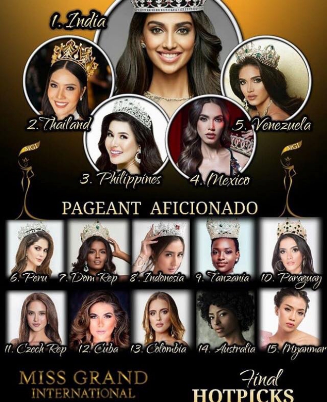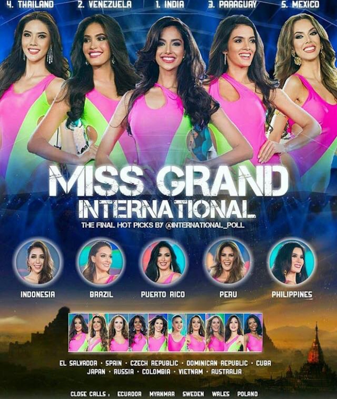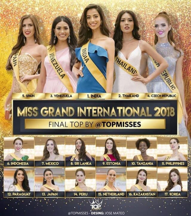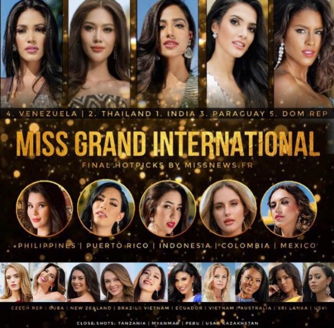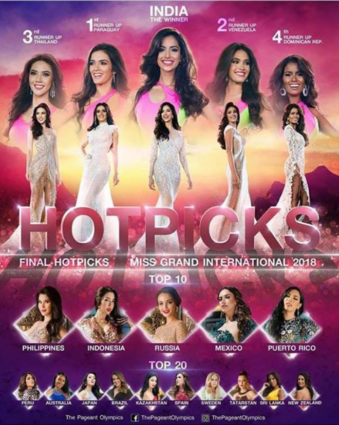 Càng về chặng đua cuối, các danh sách ứng viên cho ngôi vị Hoa hậu được nhận định ngày càng khắt khe hơn thông qua các phần thi phụ đã diễn ra. Ổn định nhất trong bảng xếp hạng đấy chính là Vệ nữ Meenakshi Chaudhary đến từ Ấn Độ khi luôn được nhận định sẽ là chủ nhân kế tiếp của chiếc vương miện Hoa hậu Hoà bình Thế giới 2018. Nằm trong top 5 luôn là Venezuela, Thái Lan, Indonesia, Philippines và một vài người đẹp khác có sự thay đổi trong các BXH này.