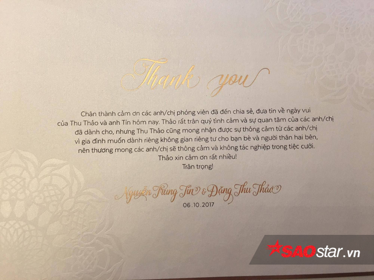 Nguyên văn lời chia sẻ của hoa hậu Đặng Thu Thảo: “Chân thành cảm ơn các anh/chị phóng viên đã đến chia sẻ, đưa tin về ngày vui của Thu Thảo và anh Tín hôm nay. Thảo rất trân quý tình cảm của và sự quan tâm của các anh/chị đã dành cho, nhưng Thu Thảo cũng mong nhận được sự thông cảm từ các anh/chị vì gia đình muốn dành tiêng không gian riêng tư cho bạn bè và người thân hai bên nên thương mong các anh/chị sẽ thông cảm và không tác nghiệp trong tiệc cưới. Thảo xin cảm ơn rất nhiều. Trân trọng!”