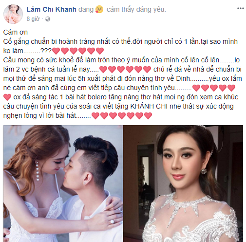 Sau lễ rước dâu được tổ chức vào sáng 28/12 tại Long Hải, hôn lễ chính thức của ca sĩ Lâm Khánh Chi và bạn trai sẽ diễn ra vào ngày 11/1 ở một trung tâm tiệc cưới lớn thuộc quận 4, TP.HCM.