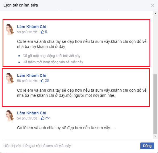 Chưa kể, status của Lâm Khánh Chi từng chỉnh sửa nhiều lần, trong đó có đề cập đến việc sẽ dọn về nhà mẹ đẻ càng khiến khán giả bất ngờ hơn. “Có lẽ em và anh chia tay sẽ đẹp hơn nếu ta sum vầy, Khánh Chi dọn đồ về nhà ba mẹ ở đây”, giọng ca Sầu thiên thu viết.
